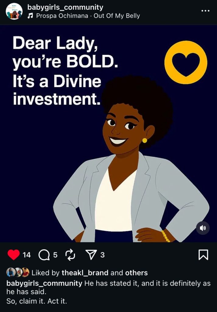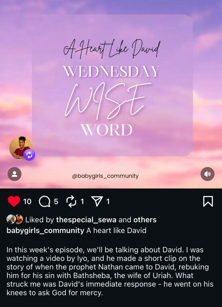 Through the anonymous question box, we allow women to be vulnerable and speak their heart troubles and desires, share their journeys and receive friendly and godly counsel. It is a safe space for honest conversations, healing stories, and heartfelt sisterhood.